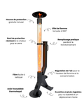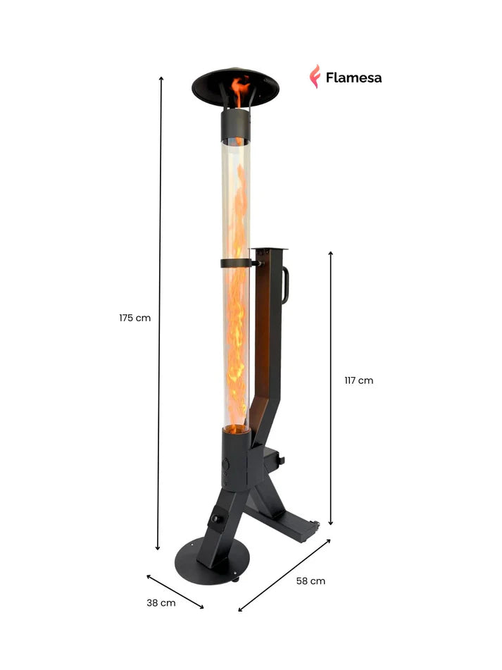 Le Flamesa Flare est composé d’un cadre en acier lourd avec revêtement thermolaqué et d’un tube en verre extra épais. La base large et la conception équilibrée assurent la stabilité, même pendant le déplacement.