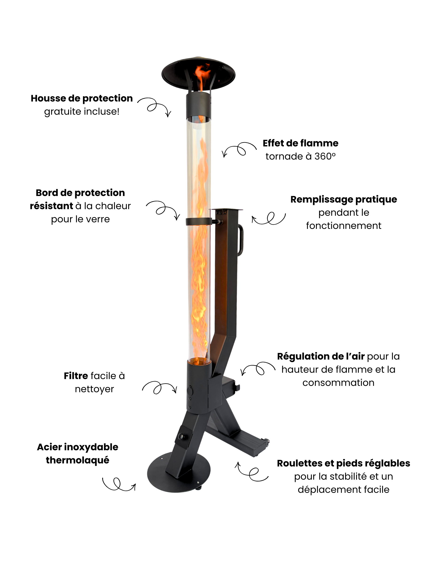 Le tube en verre vertical met parfaitement la flamme en valeur et assure une répartition uniforme de la chaleur tout autour. Pas de fumée gênante, pas d’électricité et aucune installation fixe.